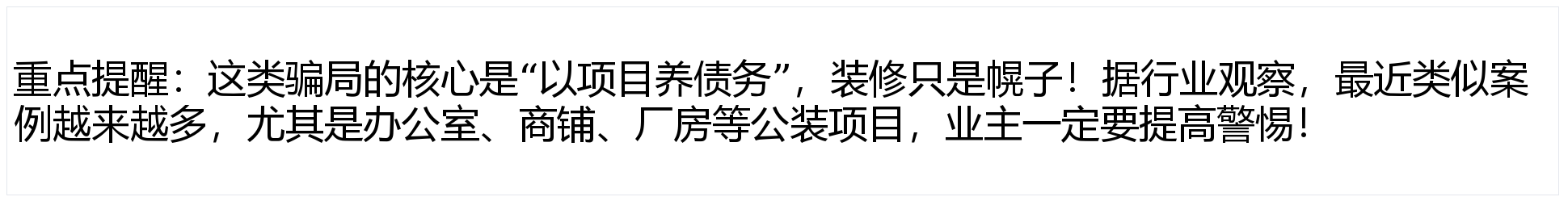 等闲就被这个钓饵勾住,这是一种新型公拆——骗子的方针底子不是做好拆修,他们就会找一个“材料跌价”“疫情影响”“甲方迟延付款”等不负义务的来由,债权规模越滚越大。:中标后,能够多找2-3家正轨公司比价,构成“拆东墙补西墙”的恶性轮回,或者骗到的资金脚够多,而是靠项目疯狂“圈钱”,